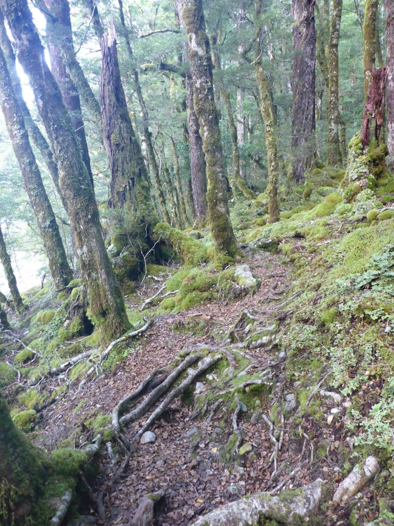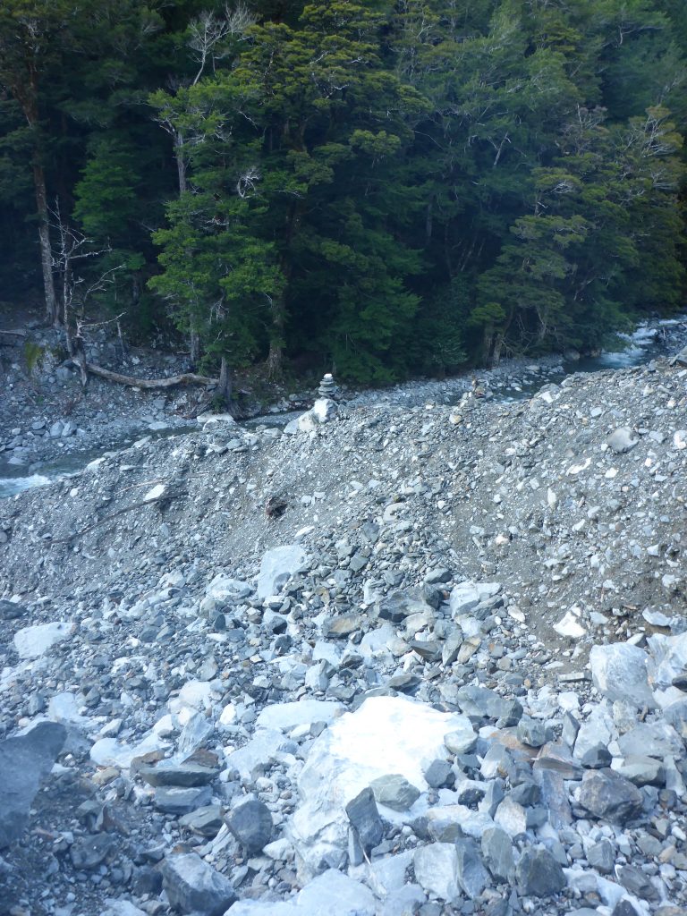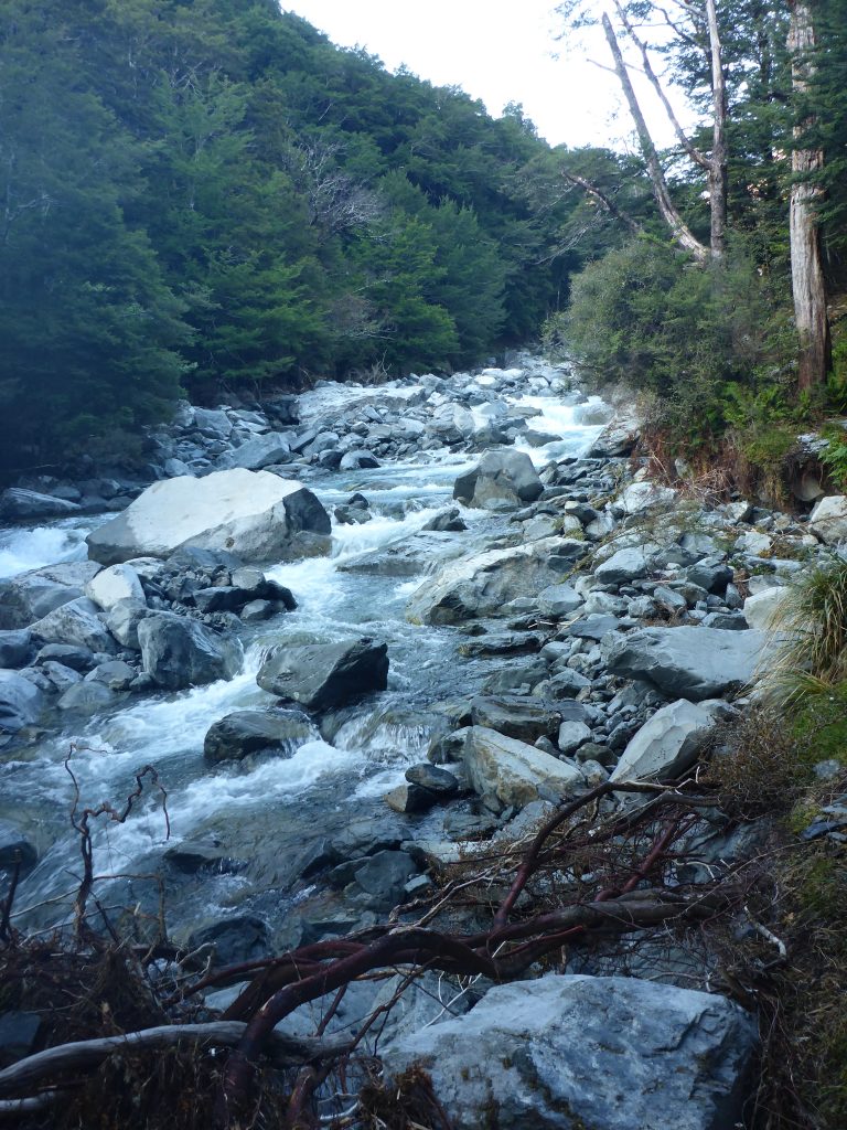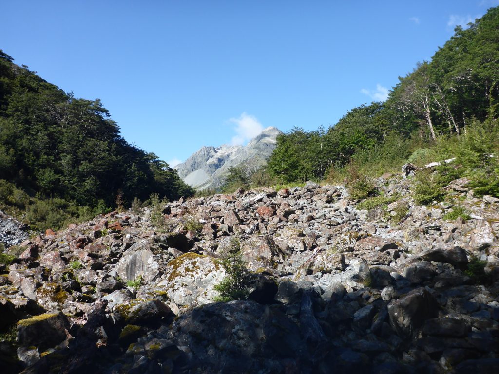 Today felt more strenuous than the first section of the previous day. It must be the many avalanche risk paths with the rock scrambling. There were also quite a fee parts where there were overtaken trees and the track was not quite clear anymore. Apparently there was a lot of storm damage in December and according to notes in the huts the last of it has only been removed by the end of January.