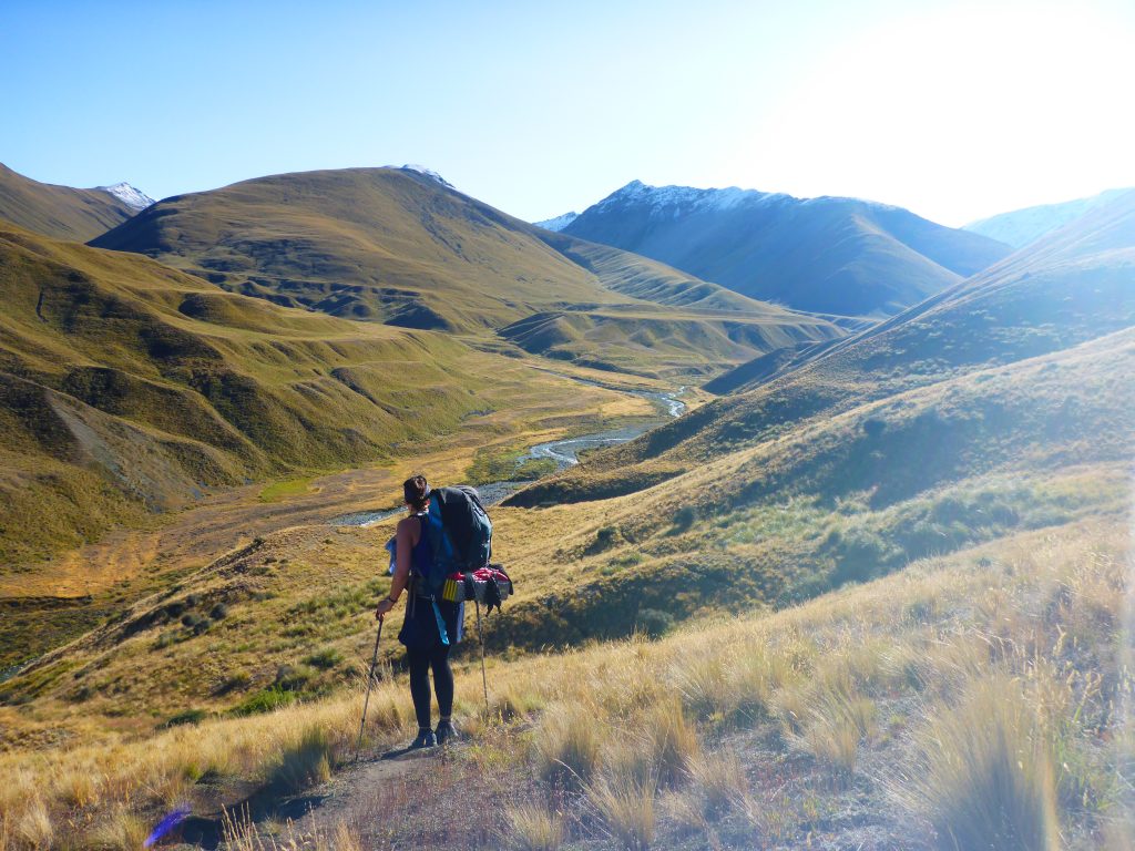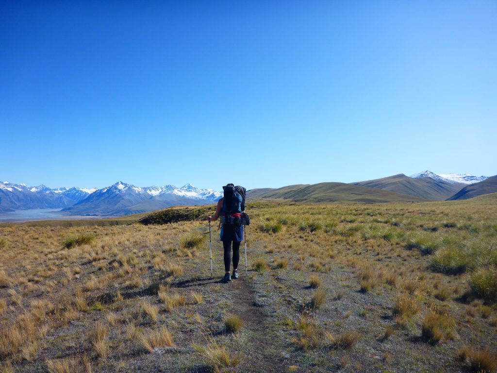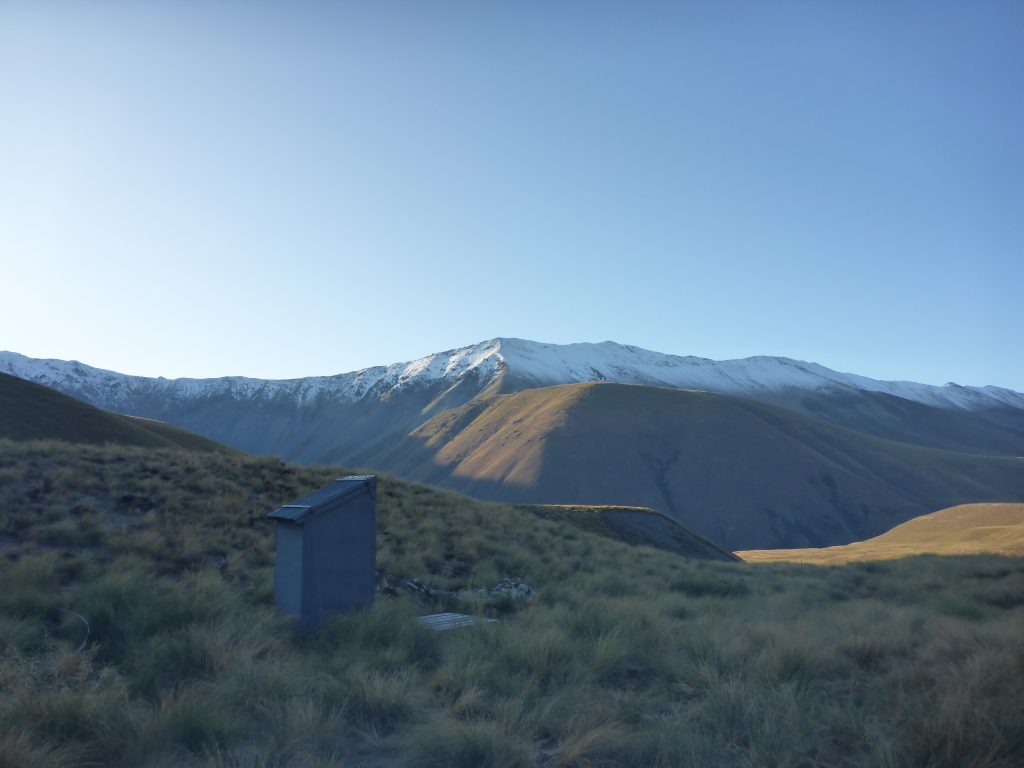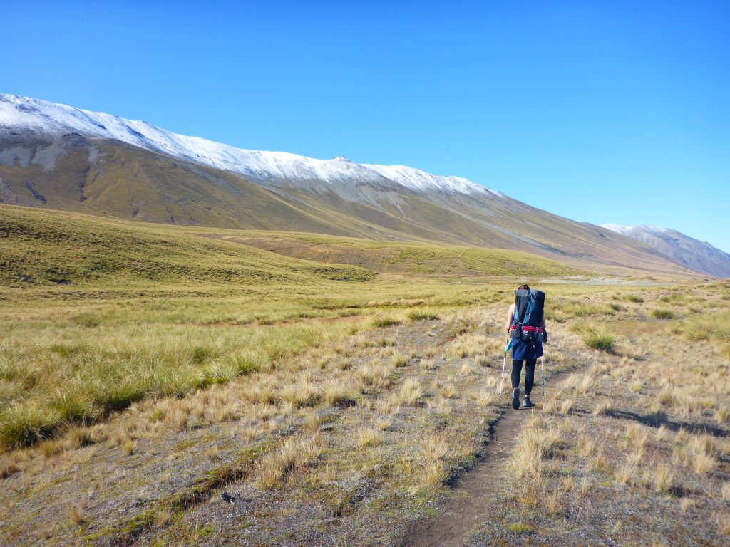 While everyone else in the hut got up at 6am, I as lazy and waited until 7:30am before getting up. I was still not quite warmed up from the previous day and didn’t fancy going outside into the cold of the morning. At 7:30am though I slowly got moving. Knowing I would walk out to Tekapo this day, I didn’t change into my still wet leggings from the previous day but kept my warm and dry longjohns on. Everything else was as usual. The shoes were sadly enough still wet, but that as to be expected. At 8:30am I then at off beneath a nice and clear blue sky.