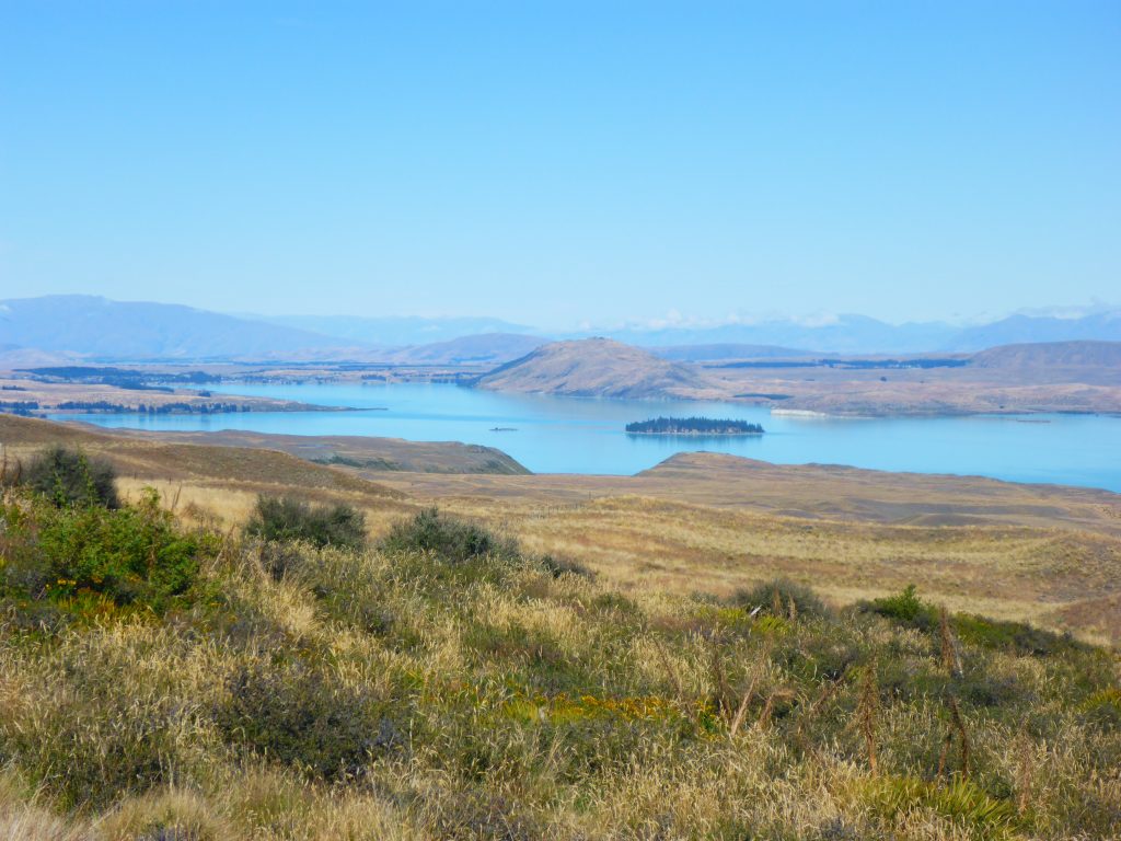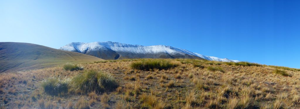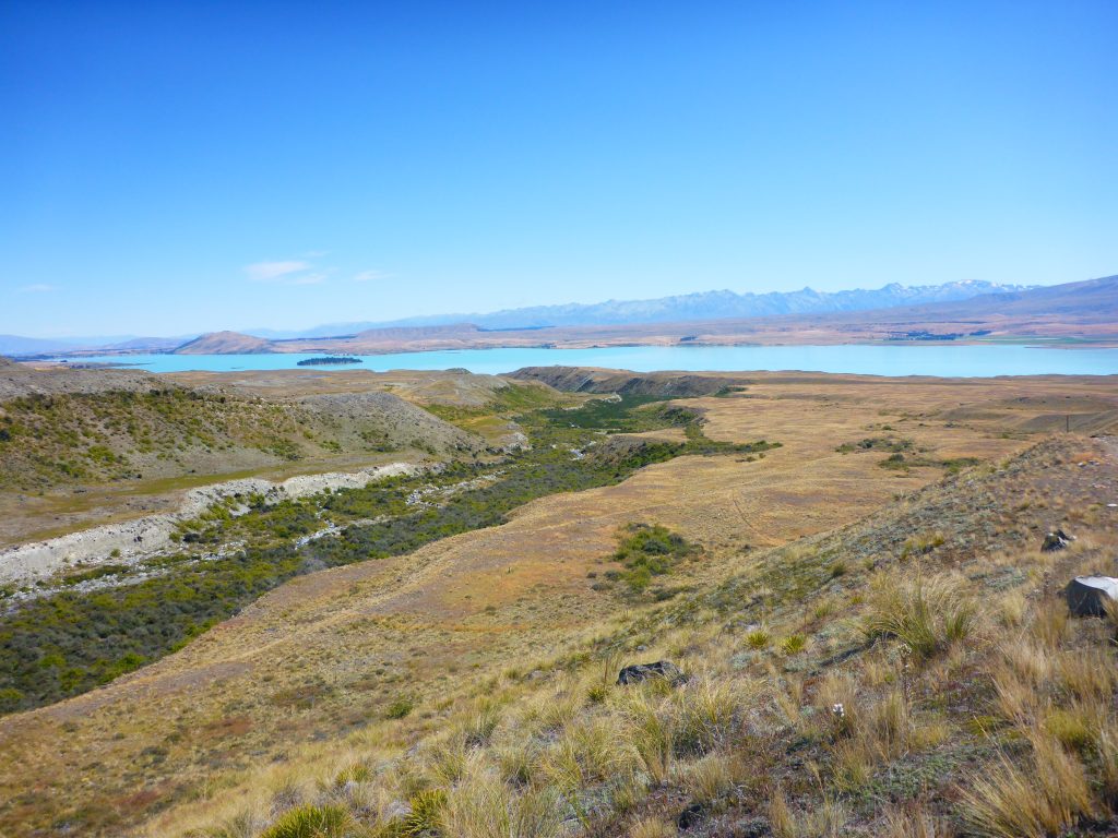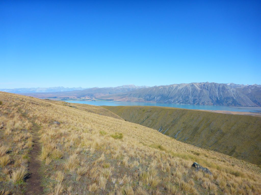 The track continued further up until I walked on a mostly flat area at the top. Now I had great views of the surrounding mountains, all with their tops covered in fresh snow. I could also see the blue colour of lake Tekapo as well.