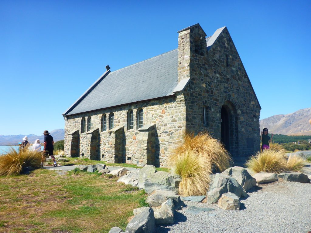 The road wasn’t travelled on a lot. As I reached it, I changed from my longjohns into my shorts. The sun is now fully blazing and there is no grass on the road for me to get allergic reactions from. So on with the shorts. Then I applied more sun lotion. As I was just finished and about to put my pack back on, a car with a boat on a trailer stopped to give me a ride into town. Well, this beats walking in the blazing sun without any shade. They them dropped me off where the road crosses the one going into Tekapo and I walked the last km into town myself again, passing the beautiful waterfront and the Church of the good Sheppard.