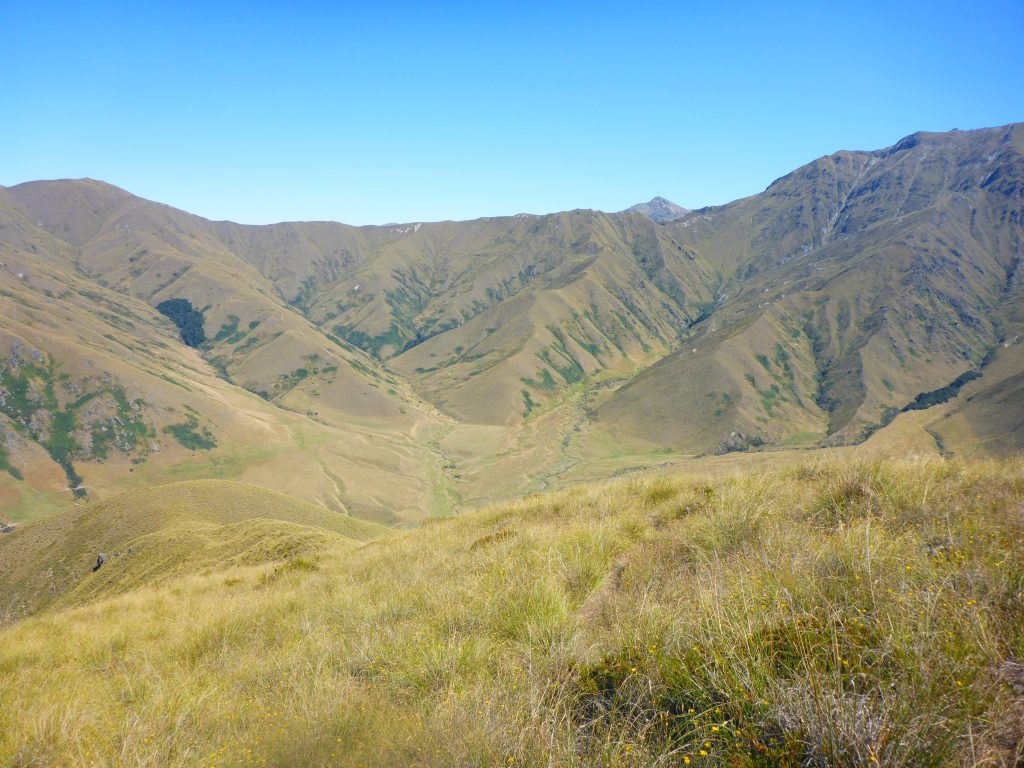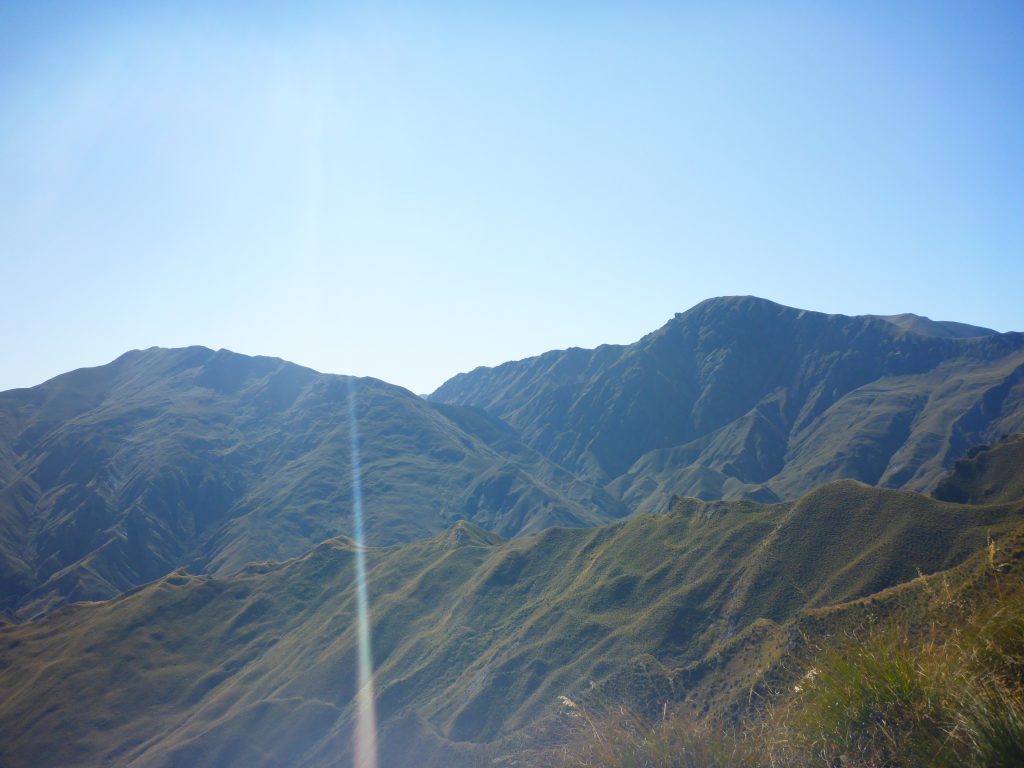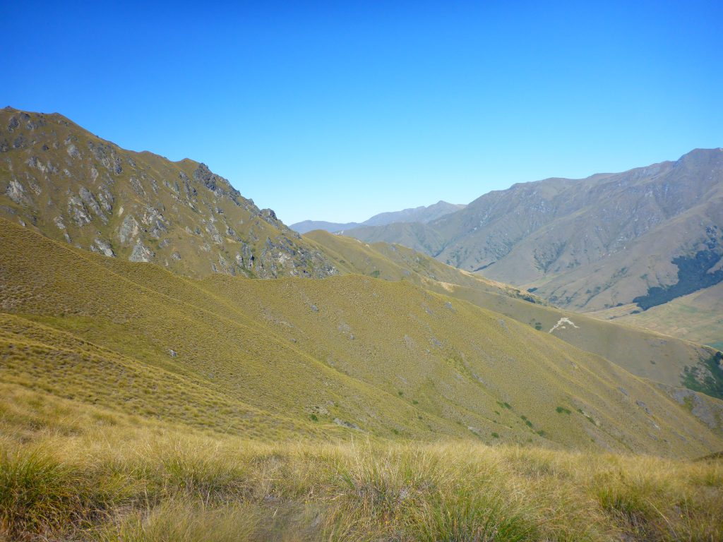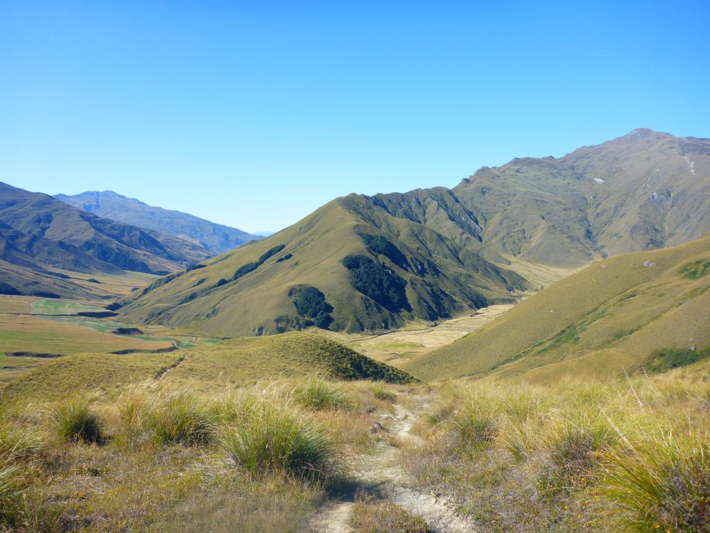 The sun was out and the weather nice, with the track affording great views again of the rugged mountains surrounding me. It took quite some time to get up to the first saddle, and the path kept tricking me, with little hilltops, where you think you have reached the top, but then you see that after a small descent you go further up again. Finally though, I reached the first saddle and had great views of the valley ahead, and the valley behind.