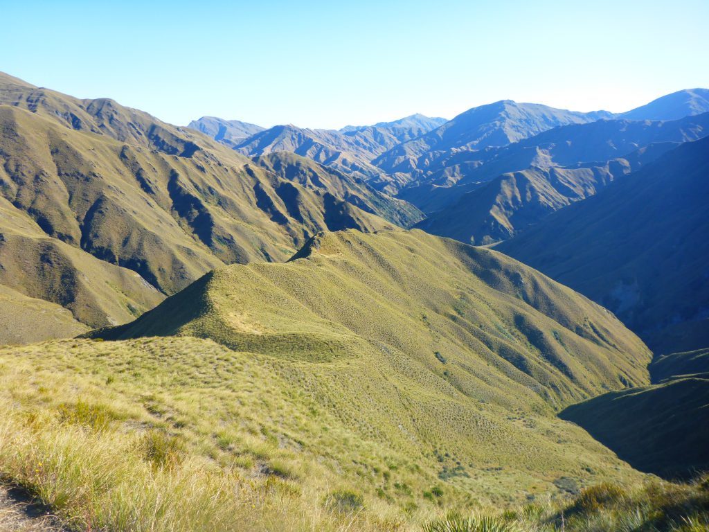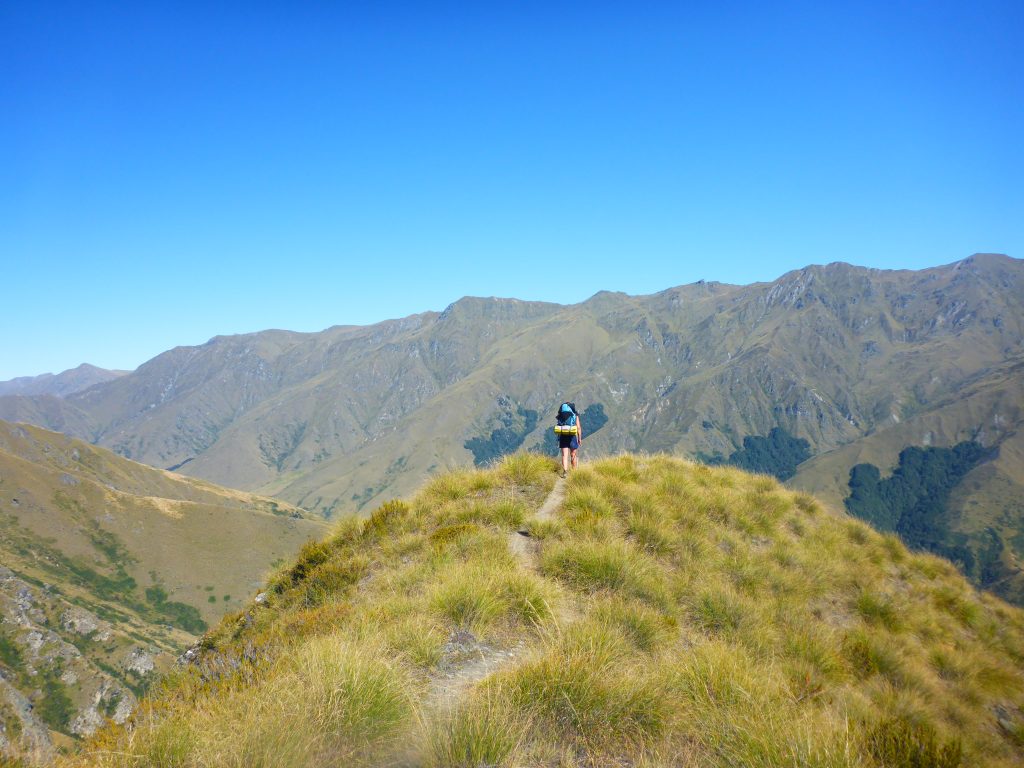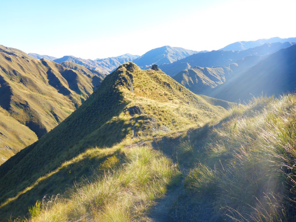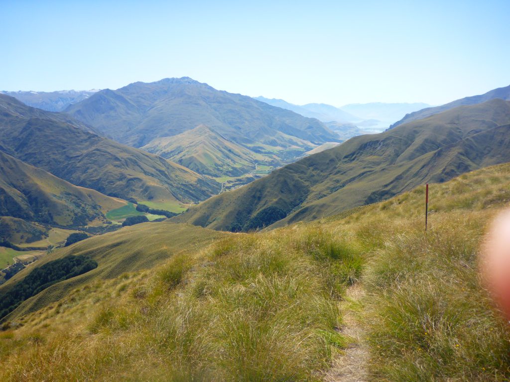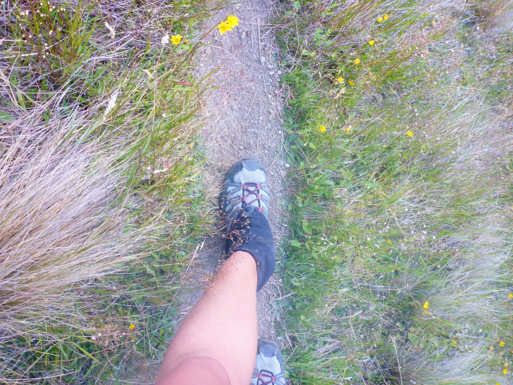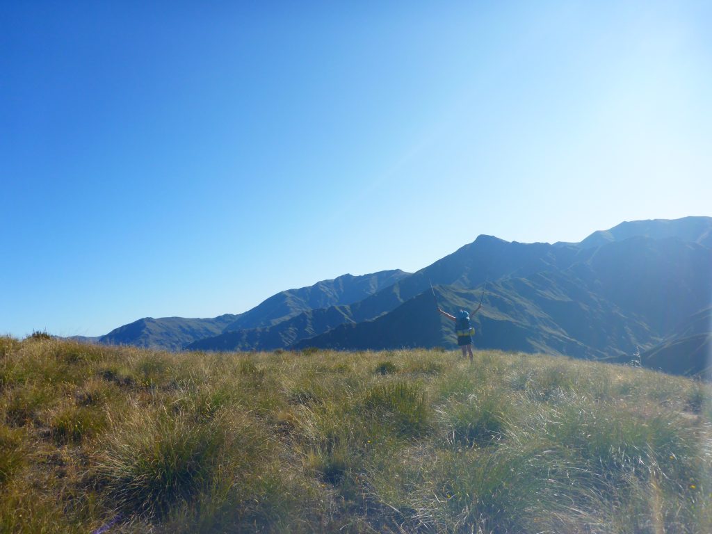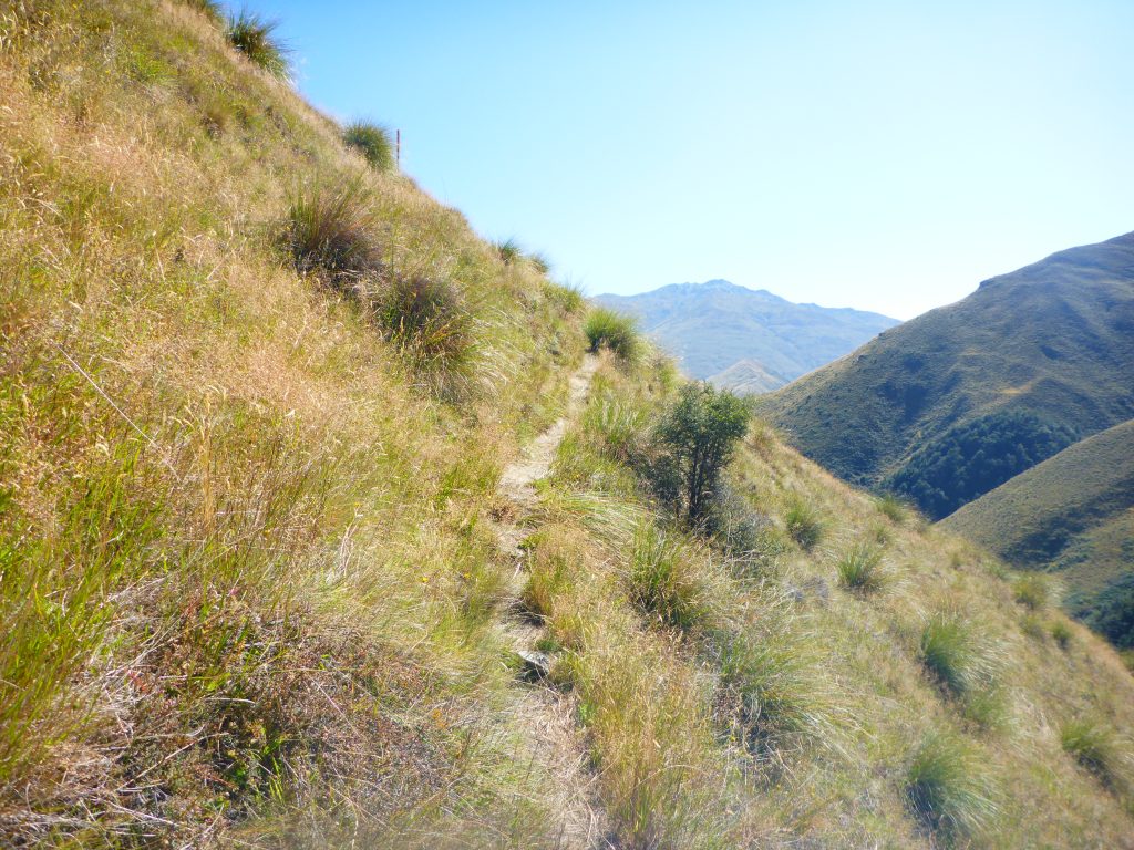 After the first steep section up, that you could see on the picture that showed the forest and hill before, the path was on slightly more even terrain. Here I found the Kiwi lounging in the grass, taking a breather. He really is moving slow. We had a short chat, where I told him that I try to avoid taking to big breaks, as I find it hard to get moving afterwards. So I continued on, wanting to reach the top and getting my next lollie break.