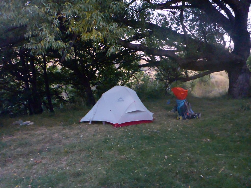 Walking in the riverbed took longer than I anticipated though and I kept checking my GPS to see how much further I was away from macetown. Finally, at around 8pm I came close to macetown, according to my GPS. I soon realised though that I should have continued on a 4W track, that went out of the river to my right. Because when I finally came upon the location of the campground, according to my GPS, I had to climb up a small cliff by the side of the river to reach it. Well, this wasn’t planned, but I also didn’t want to turn around for a detour. So I went up and found the dunny as well as some good places to pitch my tent. It was 8:20pm, just around sunset, so just in time to get everything pitched before it gets dark.