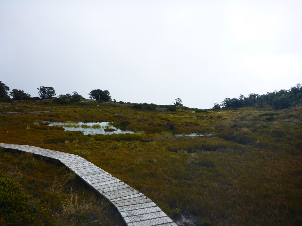 Going down the drizzle stopped and I was getting dry again. While going downhill I could see a lake towards my left down in the valley. Reaching the valley floor I had to cross a small waterway to then walk along the far side of the lake.