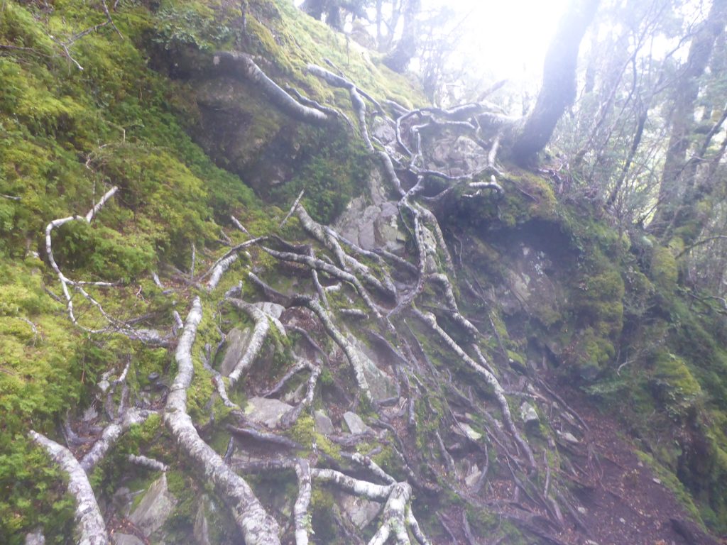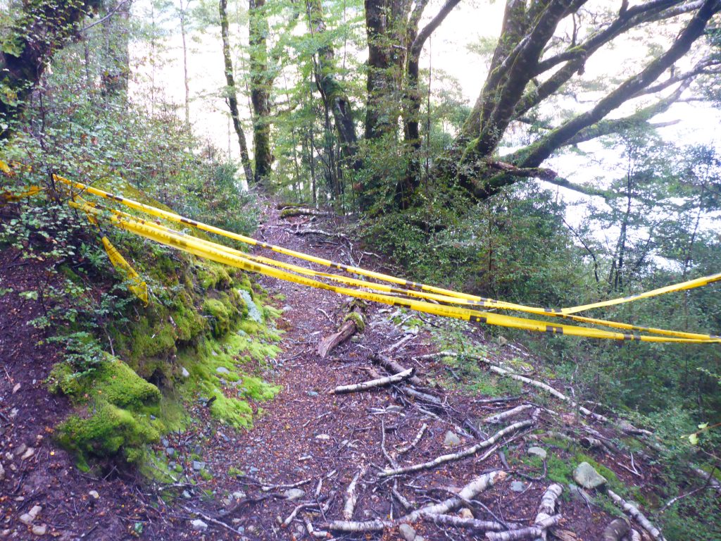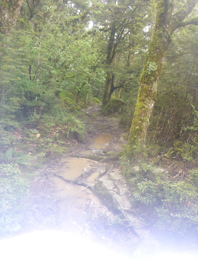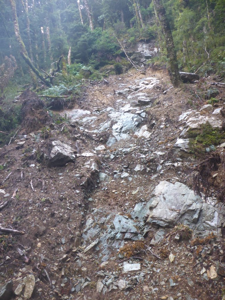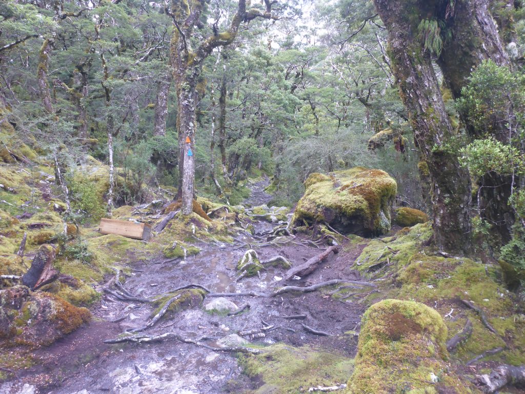 While walking through the the field I saw 2 helicopters passing by. If the two trampers hadn’t informed me about them getting transported via helicopters, I would have been worried that something happened to someone. The field soon gave way to forest sections again. Here I found a lot of muddy sections and gnarly root sections. Furthermore, there were quite a few places which had been damaged and eroded from the recent storm in February.
