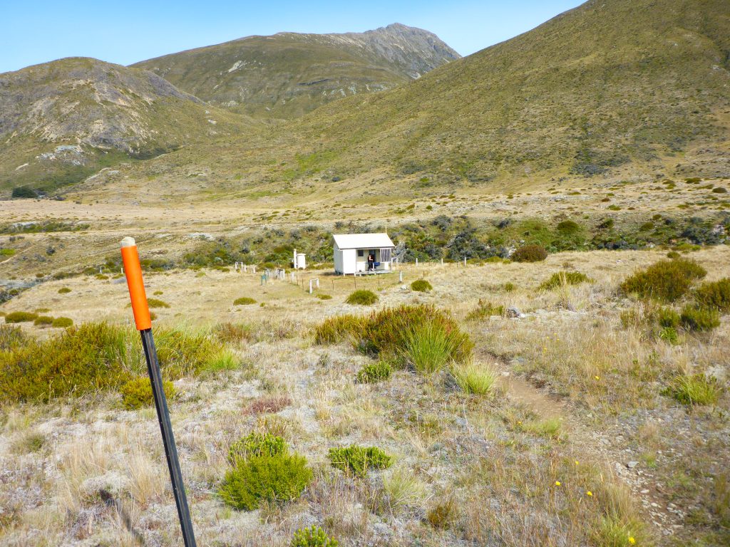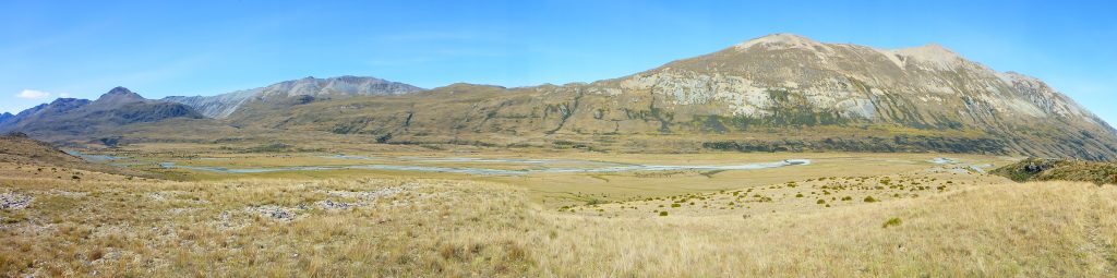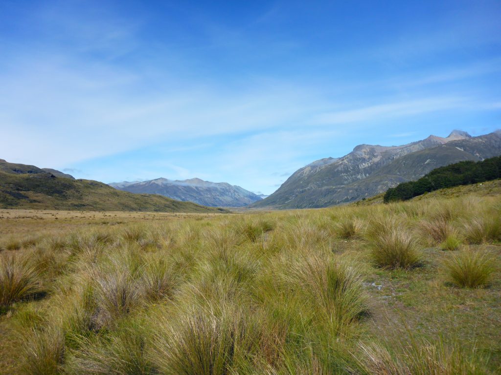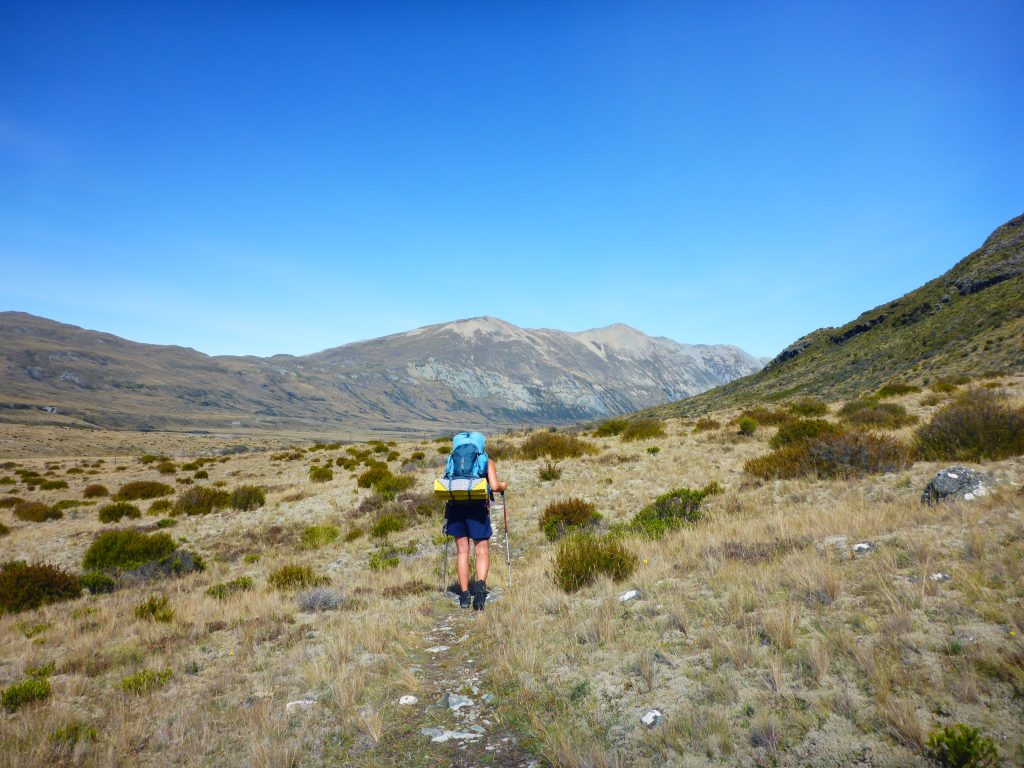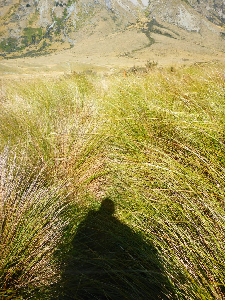 After noon though the sun was shining, and there were no more forests to walk through. It was now open tussock, with wide views. At 1pm I reached Taupo Hut. And though I do not like to stop for long breaks, as this brings me out of my tramping flow, I had to stop and fix my shoes a little bit, as one of the holes was growing, and I didn’t want to end up with ripped shoes so close to the finish.