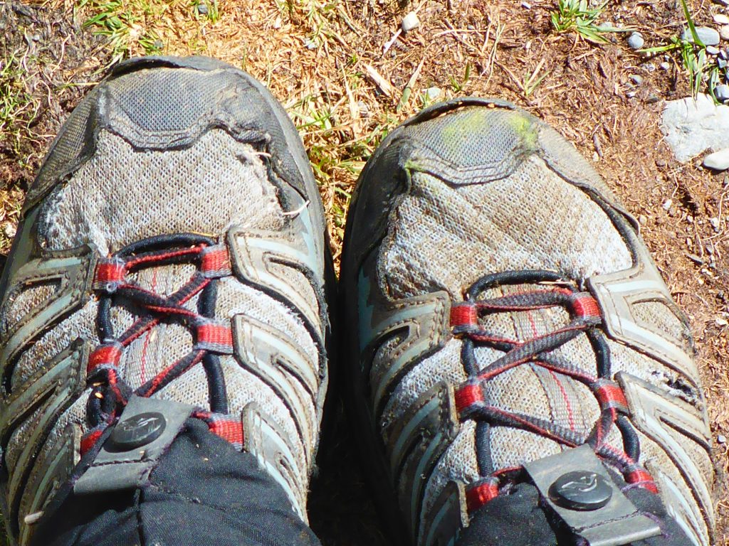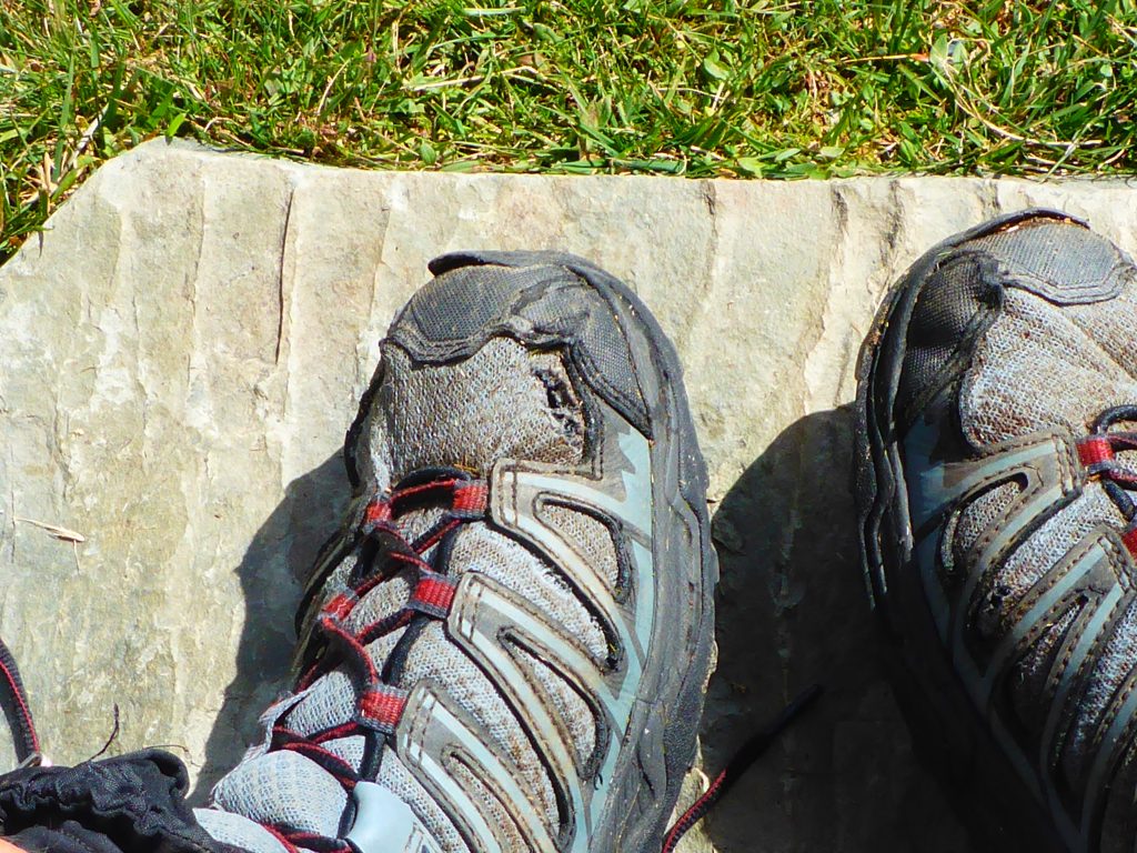 Considering that I have now spent 2 months walking in my shoes, through fast and slow rivers, rocky boulder fields, muddy paths, spinaird grass, thistle, gorse bush, thick bush, etc, I am surprised by how little the shoes are damaged. There is one hole on the right shoe which is between where the laces are attached. This wont become a problem, as it the material between doesn’t have to hold much. The only problematic one is a bigger hole by my big left toe, which is slowly growing while I am walking. Luckily enough, it has been a few days since I have been in town, and I was able to use 2 dental floss pieces from my rubbish bag.
