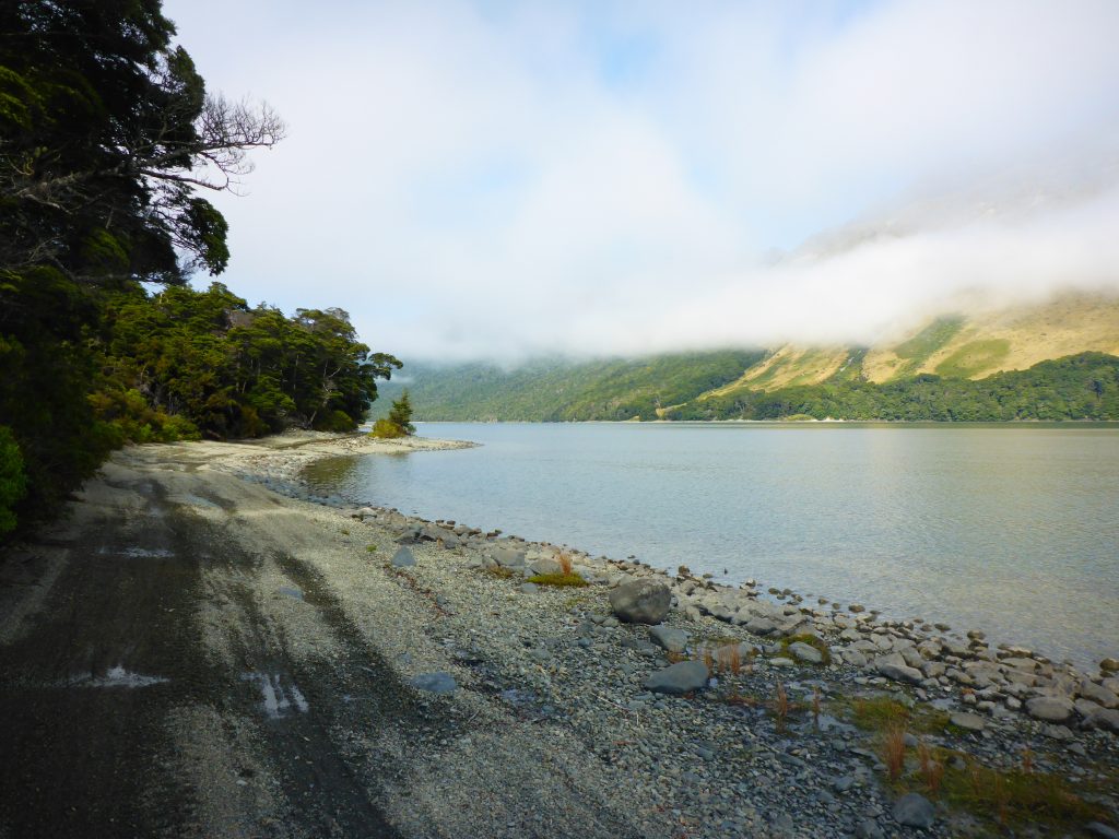This morning I had a lazy start of the day. I had already decided not to go all the way to Te Anau, and would be taking a short trip off trail to Kiwi Burn Hut. When I finally had all my things assembled and was ready to set off at 10am, there were really low hanging clouds across the lake.