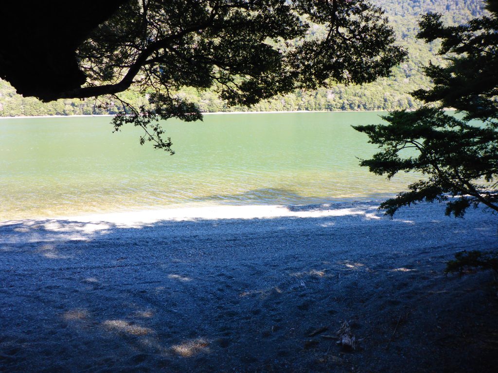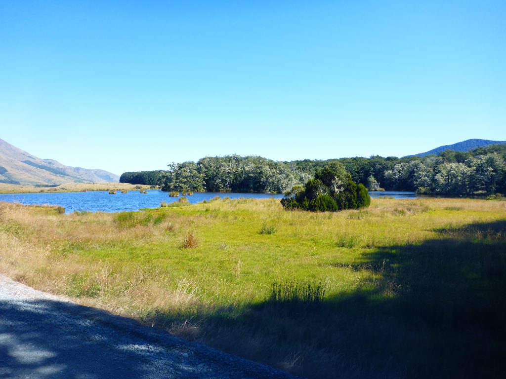 The track continues to follow a 4W track along the North Mavora Lake, and during the morning I did come across a few SUV’s coming my way. Throughout the morning the clouds slowly started to clear, and the sun came out. While initially following the 4W track in tussock country, it moved on to go along the lake through the woods, becoming more and more enchanting.
